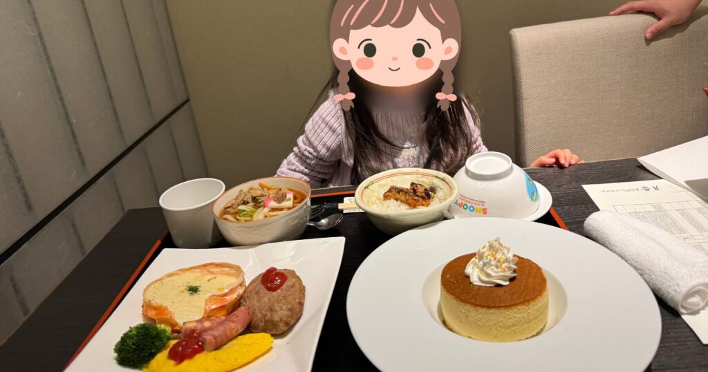 朝食のパンケーキに子供は大喜びで、「あのおっきいパンケーキのホテルまた行こう!」と言っているほど印象に残ったようです。うどん、白米両方ついていて、ありがたいですね。