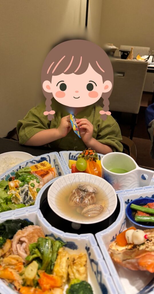 大人の料理はコース料理的に順番になかなかゆっくり出てくるので、子供が飽きてしまい夫婦交代で急いで食べました・・・察